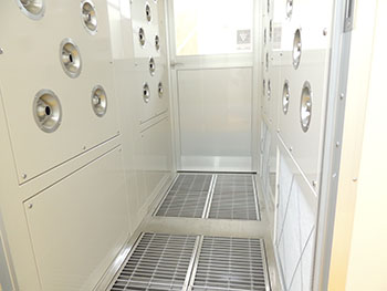作業着の着衣後の除塵として使用します。作業用途や通過対象人数や時間などによって、エアーシャワーの大きさや寸法、風の流れ(両吹き出し、片吹き出し、壁吸い込み、床吸い込み)、扉や壁材の使用などを選定します。